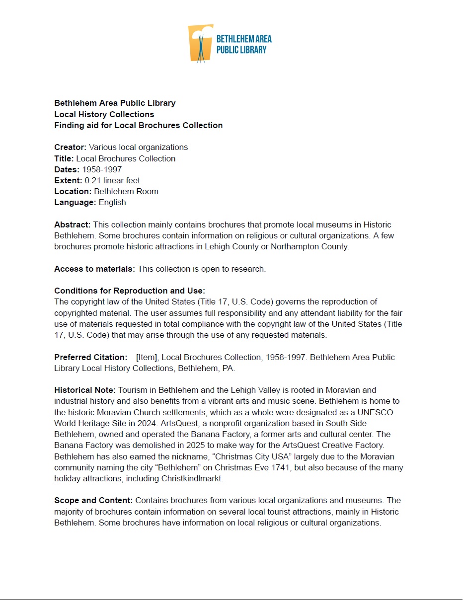 This collection mainly contains brochures that promote local museums in Historic Bethlehem. Some brochures contain information on religious or cultural organizations. A few brochures promote historic attractions in Lehigh County or Northampton County. This collection mainly contains brochures that promote local museums in Historic Bethlehem. Some brochures contain information on religious or cultural organizations. A few brochures promote historic attractions in Lehigh County or Northampton County.