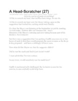 A Head-Scratcher - 27th in a series of posts on parking "I'd like to scratch my head. But Gadflies have wings. No can do. I’d like to scratch my head over the Mayor taking a pass on the suggestion that limited free parking could work fiscally. It’s clear the Mayor was listening at the September 20 public meeting. He took notes. (Neither BPA nor Desman did – boo!)